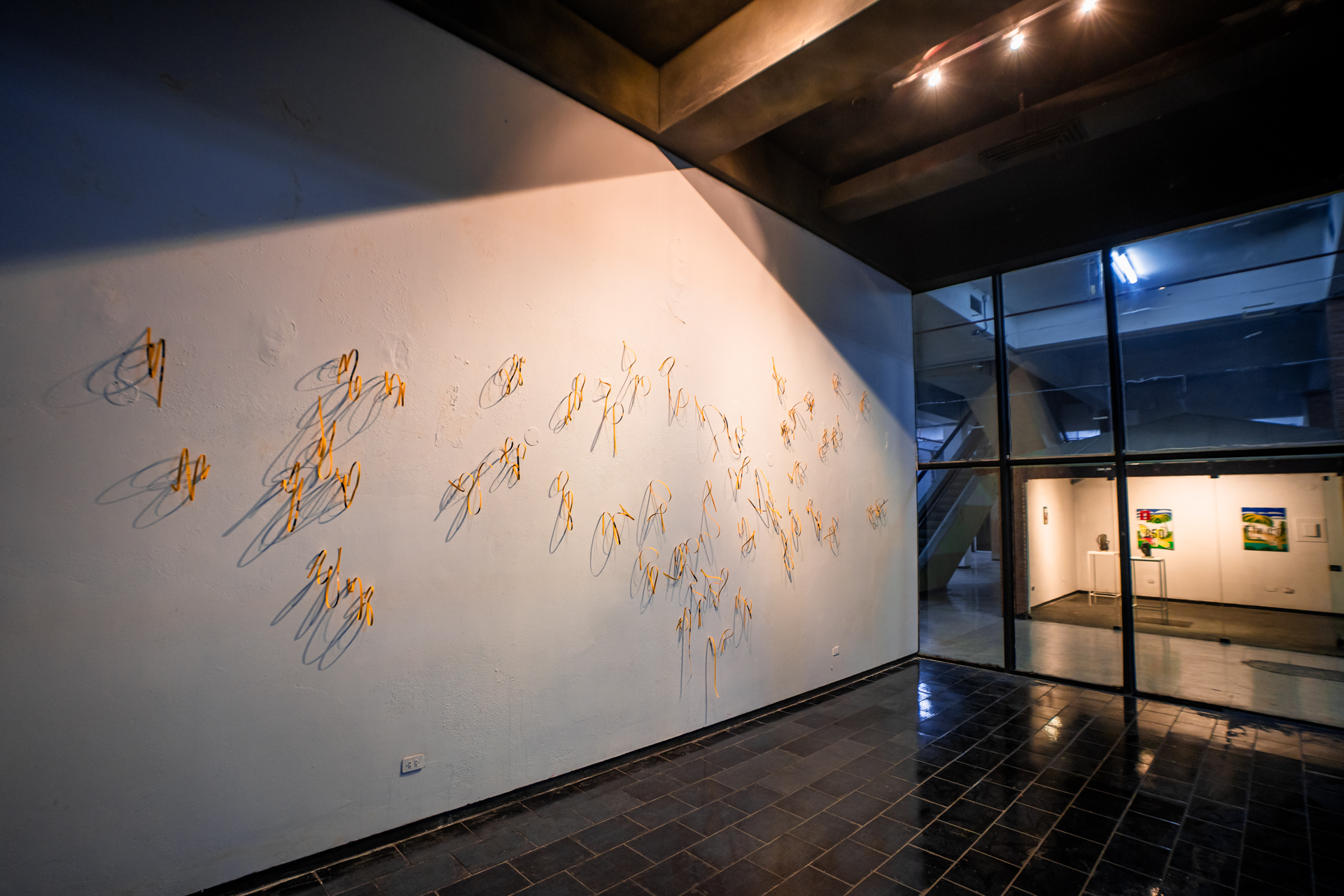 Como parte de mi experimentación con superficies escritas, corté en tiras la reproducción manual de un cartel de señalización para ocultar su mensaje y jugar con la materialidad de la fibra. La proyección de las sombras, producto de la torsion que forcé sobre las tiras, me recordaron a la forma en que las narraciones pueden ser representadas y en cómo una vida puede transformarse cambiando ligeramente el sentido en que puede ser vista. Con este conjunto de cuerpos de papel, traté de capturar al fantasma que habita el sótano del Centro Comercial Camino Real, sede de Proyecto Amil donde participo como residente artístico.